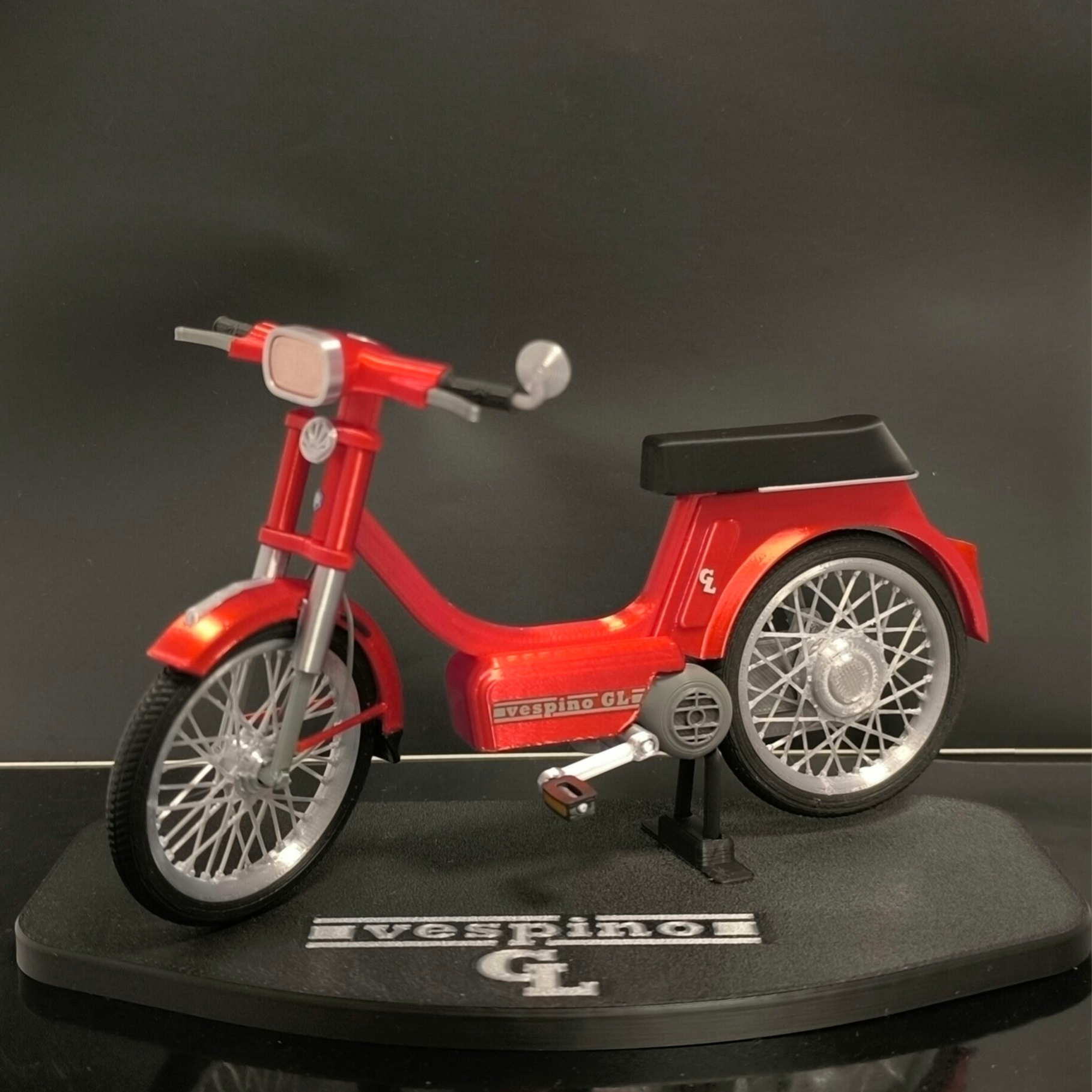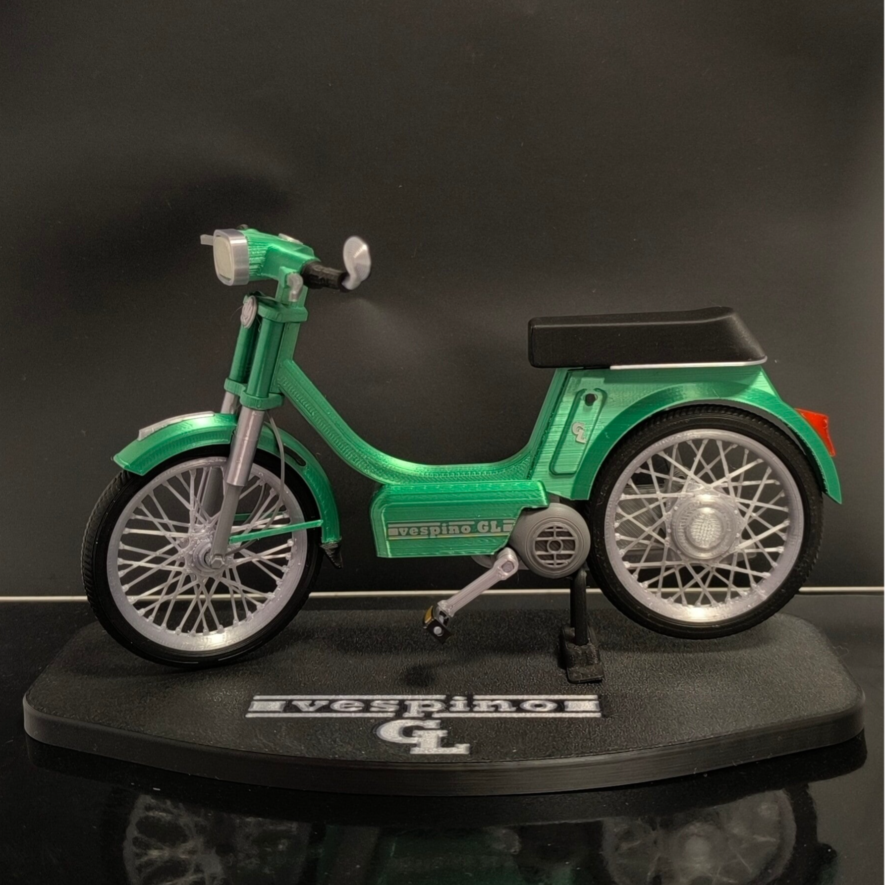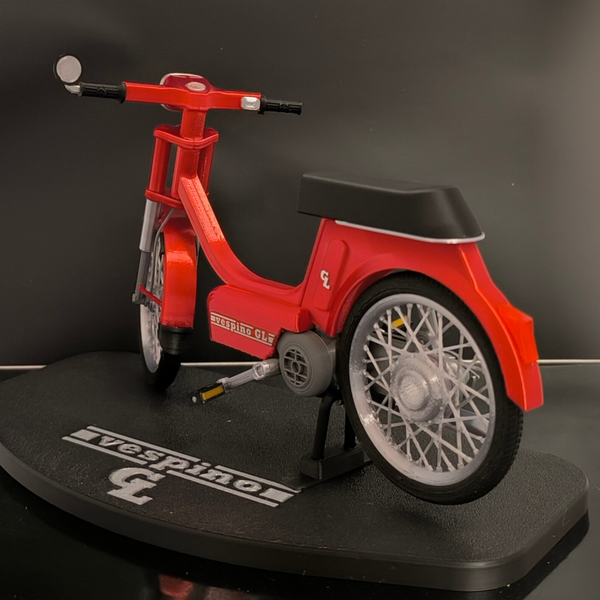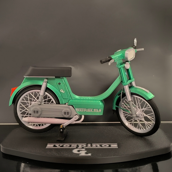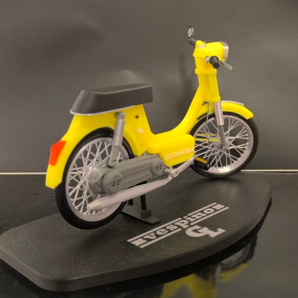 Miniatura del clasico Vespino GL a escala 1/10, al igual que el Mortadelo gran parte de su encanto reside en las llantas de radios, muy detallada y con partes móviles (Ruedas, dirección, pedales, caballete)