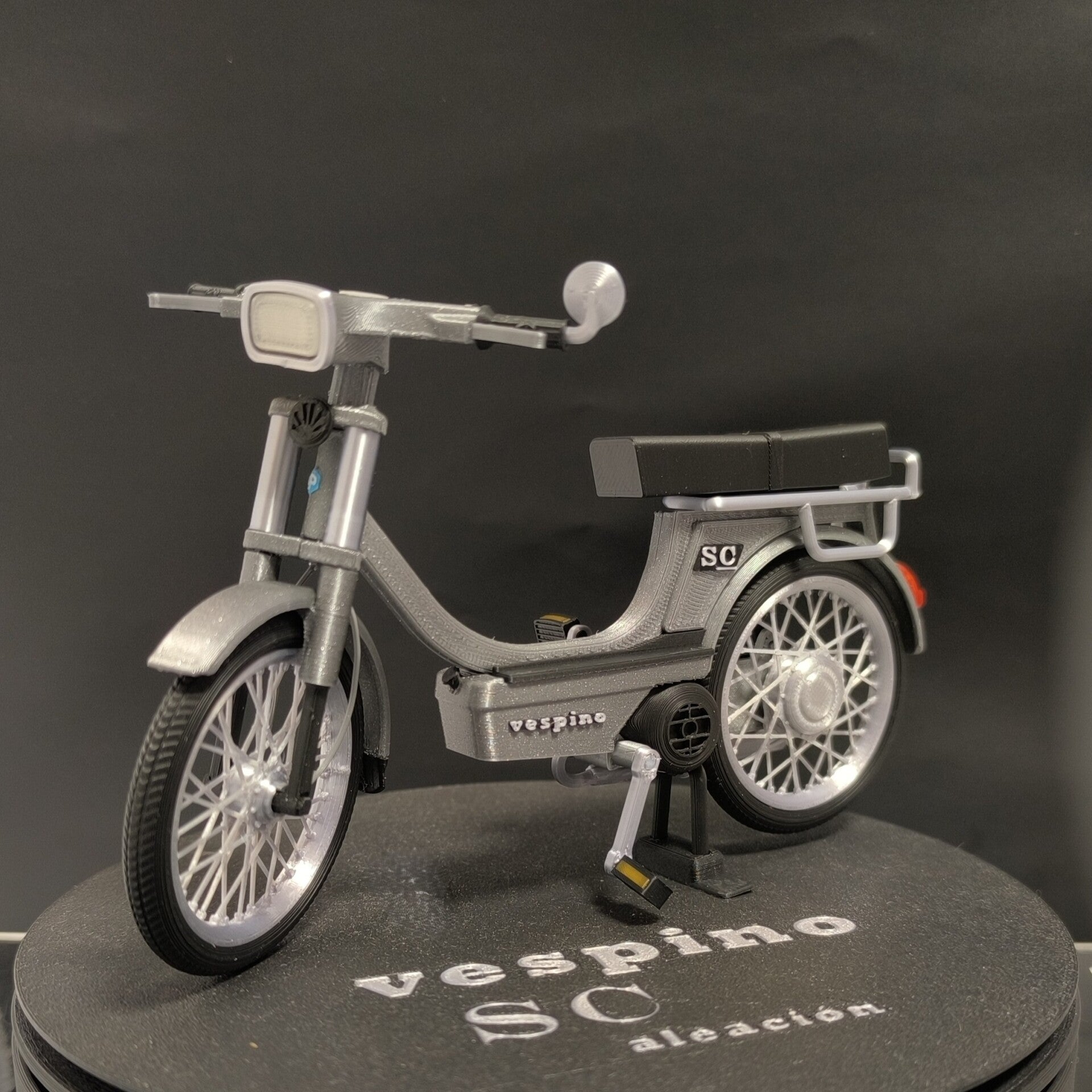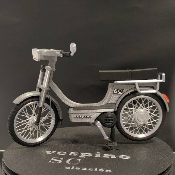 Impresionante Miniatura del clasico Vespino SC en la version con llantas de radios a escala 1/10, muy detallada y con partes móviles (Ruedas, dirección, pedales, caballete)