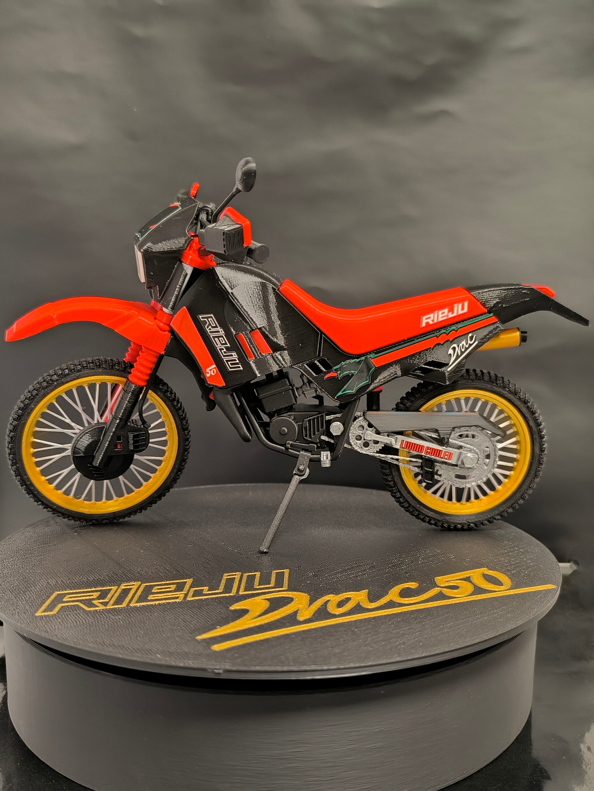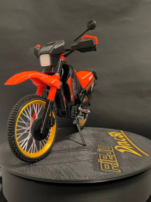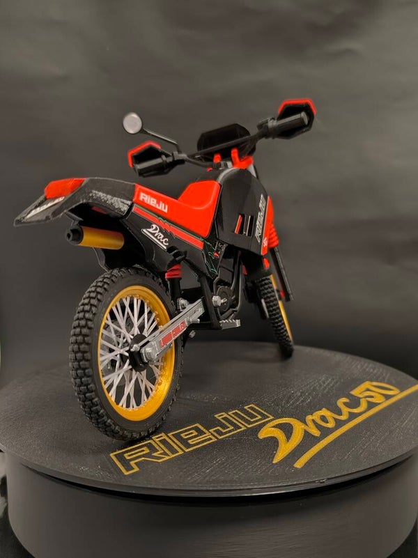 Miniatura de esta clasica Rieju Drac 50cc de los 90 con los vinilos Dragón en su primera serie a escala 1/10.